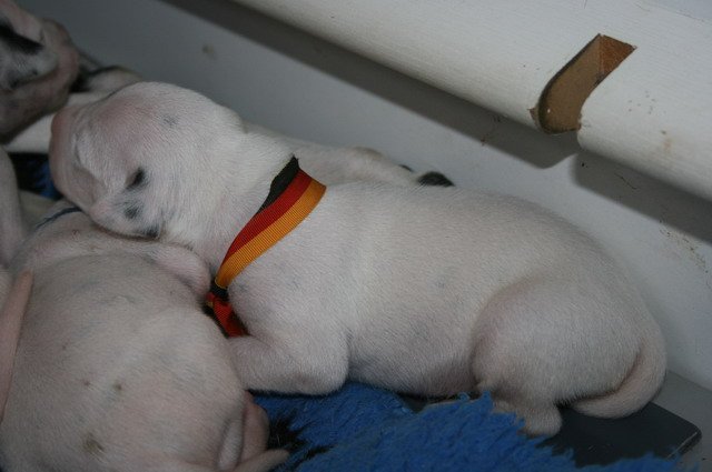 Huhu,ich bin der Älteste und natürlich habe ich auch gleich sofort schon einen Punkt!!!Ich trage das "Germany"-Bändchen und bin ein schwarz /weißer Rüde!!!