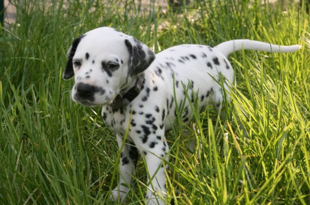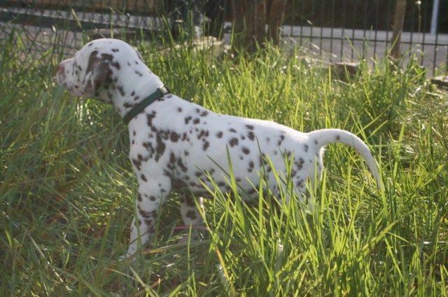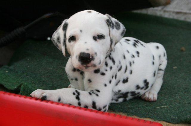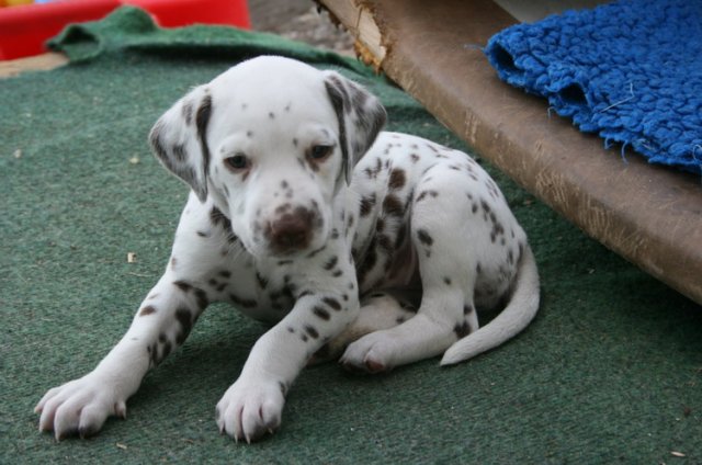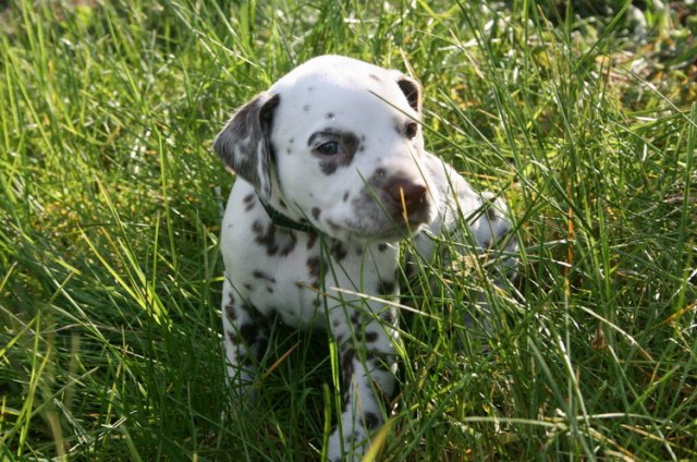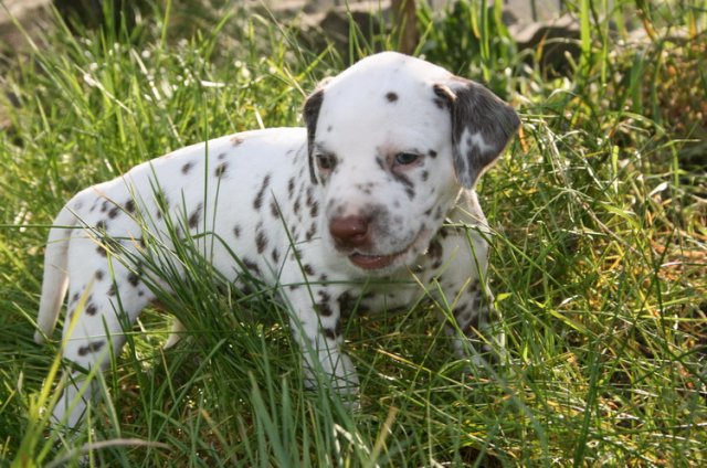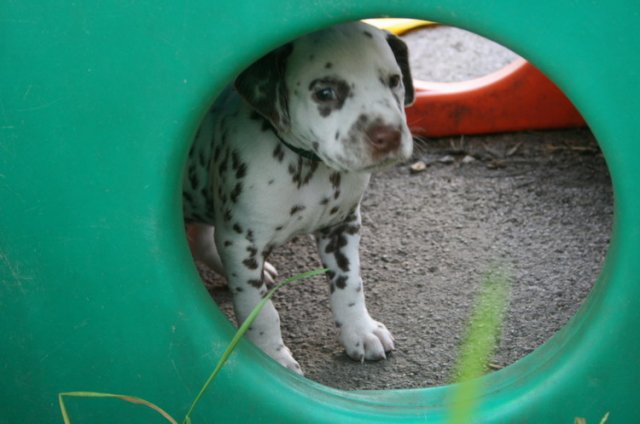 Eine Superwoche war unsere 5.Woche !!! Das Wetter ist toll und wir sind ins Welpenhaus umgezogen.Wir können drinnen und draußen spielen und toben und immer mehr gibt es zu entdecken !!!Wir hatten Besuch --auch von anderen Dalmis--es war wohl Verwandschaft von uns !!!--Wir werden bestimmt auch mal so groß!!-Dann hat unser Frauchen uns alle einzeln "getestet" wie sie sagt----danach hat sie uns alle abgeknutscht und gesagt,daß wir super hören !!!--Ja ,natürlich,wir wollen ja alles mitkriegen !!!! So,jetzt viel Spaß mit den neuen Fotos !!!