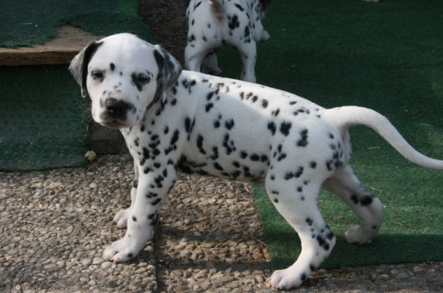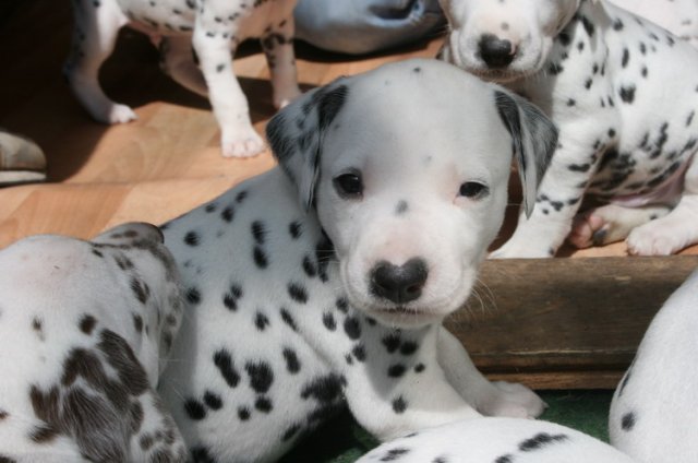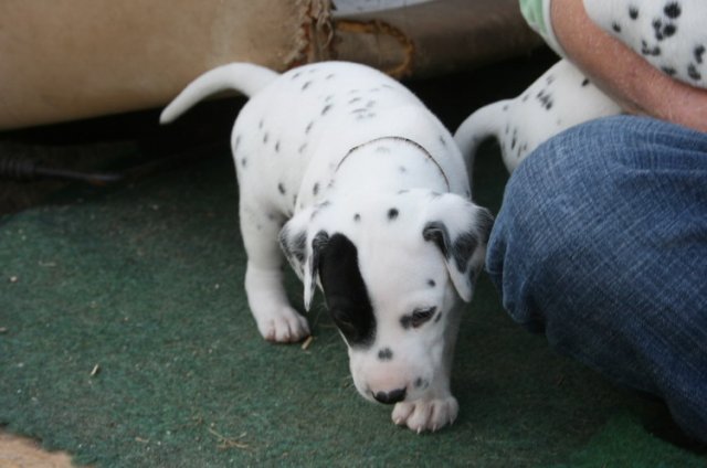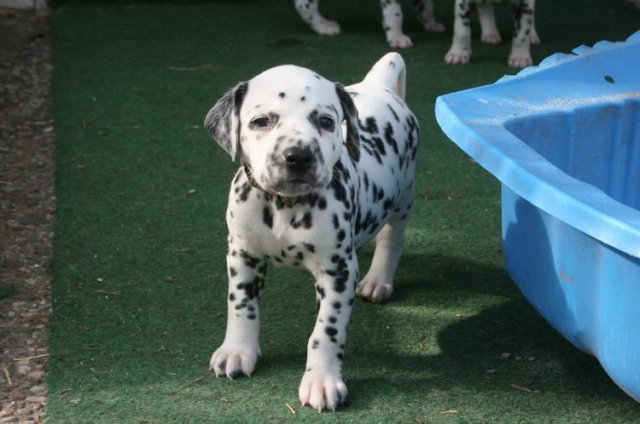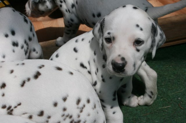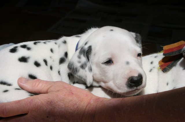 Eine Superwoche war unsere 5.Woche !!! Das Wetter ist toll und wir sind ins Welpenhaus umgezogen.Wir können drinnen und draußen spielen und toben und immer mehr gibt es zu entdecken !!!Wir hatten Besuch --auch von anderen Dalmis--es war wohl Verwandschaft von uns !!!--Wir werden bestimmt auch mal so groß!!-Dann hat unser Frauchen uns alle einzeln "getestet" wie sie sagt----danach hat sie uns alle abgeknutscht und gesagt,daß wir super hören !!!--Ja ,natürlich,wir wollen ja alles mitkriegen !!!! So,jetzt viel Spaß mit den neuen Fotos !!!