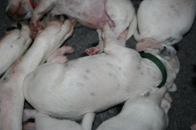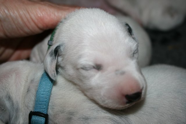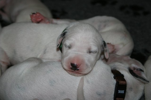 Nun sind die Welpen schon eine Woche alt und sie haben ihre Geburtsgewichte verdoppelt.Der eine oder andere hat auch noch eine "Schüppe draufgelegt".So bringen sie 630 bis 920 Gramm auf die Waage .Sie entwickeln sich prächtig und ein paar Tupfen sind auch schon zu sehen.Die winzigen Krallen sind gewachsen,sodaß sie schon gekürzt wurden.Mylady umsorgt alle fantastisch und ich helfe ihr wo ich kann.Meistens schlafen unsere"Babies"oder trinken aber wenn sie auf der Suche nach Mama sind- sind sie schon ganz schön schnell.Sie kuscheln jetzt schon unheimlich gerne und fühlen sich bei uns auf oder im Arm sehr wohl.Nun die Bilder der ersten Woche.