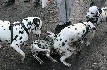 Mein Rudelchef bog grade um die letzte Kurve, als ich sie schon sah, auf dem Parkplatz darauf wartend, dass bald alle Familienmitglieder eintreffen mögen: Meine Geschwister Gino, Gipsy und Gismo, auch Gracy und meine Mama Darina, die vielen anderen Halb- und Halb-Halb-Geschwister, Nichten und Neffen, halb oder ganz, und fast der komplette J-Wurf war ja auch gekommen! Mein Herz, ja das sprang in die Höhe vor Freude! Erst recht, als ich meine Ziehmama Manuela und meinen Ziehpapa Manuel sah – da war kein Halten mehr!!! Und glaubt mir bitte: Ein Dalmi kann nicht nur lachen vor Freude, nein … er kann auch echte Freudentränen vergießen vor Glück ... Es waren so viele gekommen, um mitzuwandern, auch diesmal wieder von weither, alle sind sie dem Familienruf gefolgt – und wurden mit einem wunderbaren Tag belohnt!