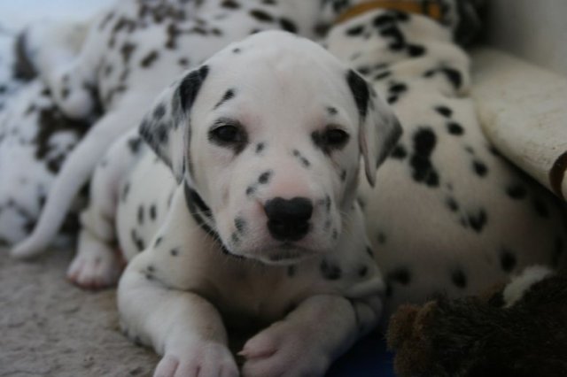 Hallihallo--uns geht es spitze!!!--Wir haben 2 Mamas !!!Natürlich unsere weltbeste Dalmimama und unsere 2.Mama .Die bringt immer Futter mit und da ist noch Joghurt drüber --lecker !--Sie sagt ,wir sollen gut essen,damit wir groß und stark werden .--Und was soll ich Euch sagen --wir essen gut und dann Abends immer Rindertartar noch !Wir haben auch schon ordentlich zugenommen von 2040 Gramm bis 2960 Gramm.Unsere Augen sind schön ummalt und wir weiß schwarzen haben alle braune Augen--richtig schön dunkel und die weiß/braunen bekommen bernstein farbene Augen.Viel Spaß mit den Fotos!Bis nächste Woche!