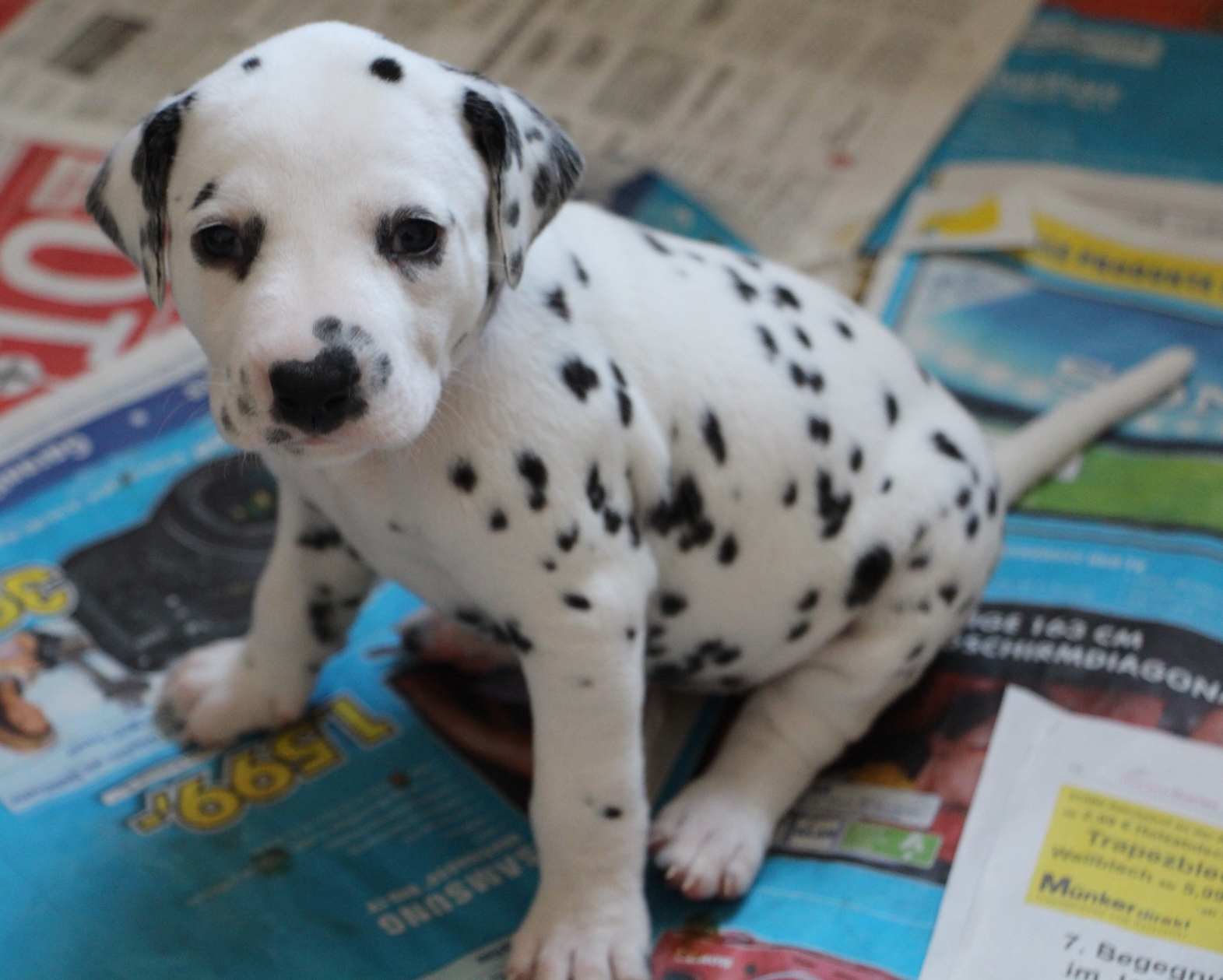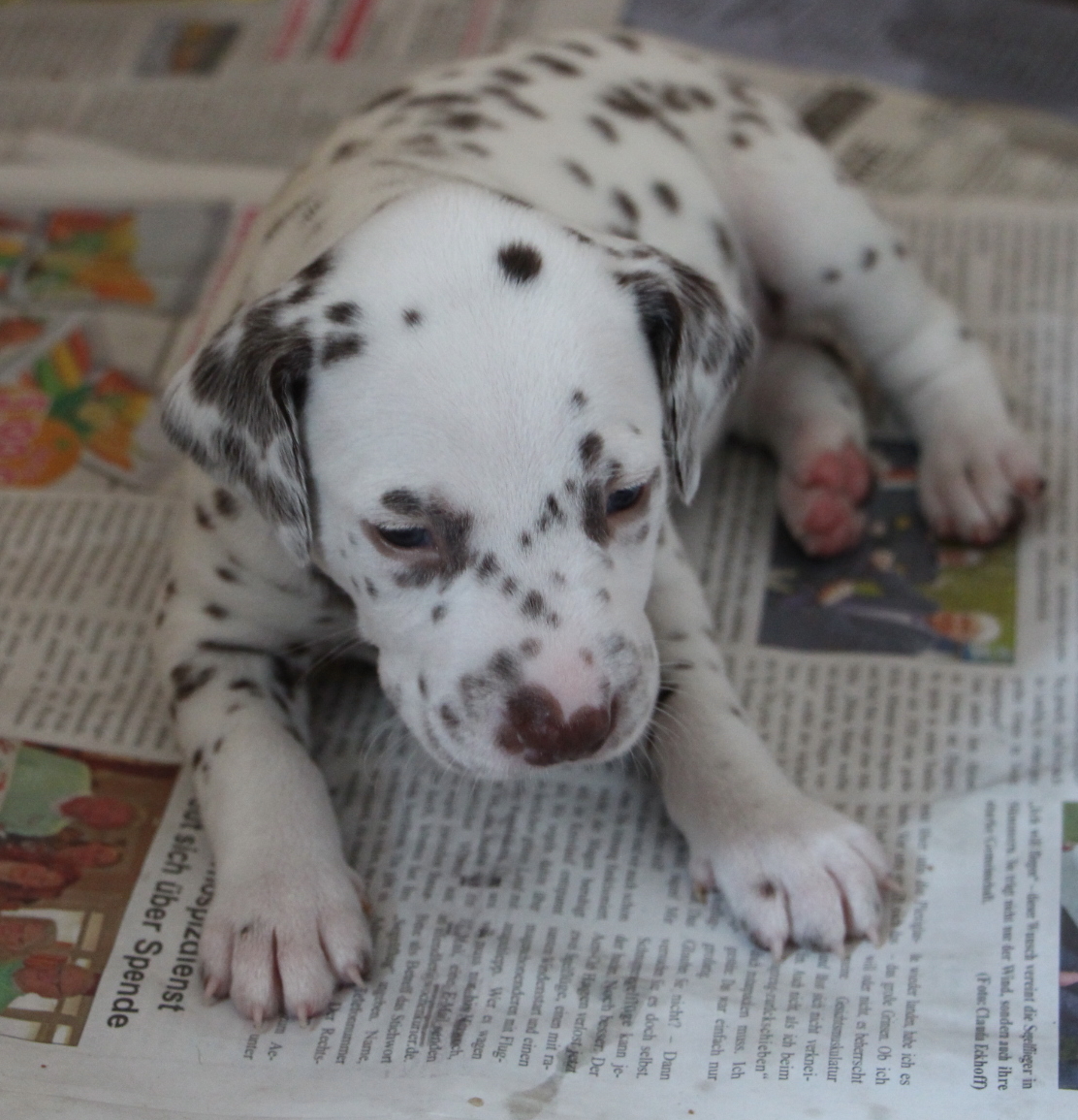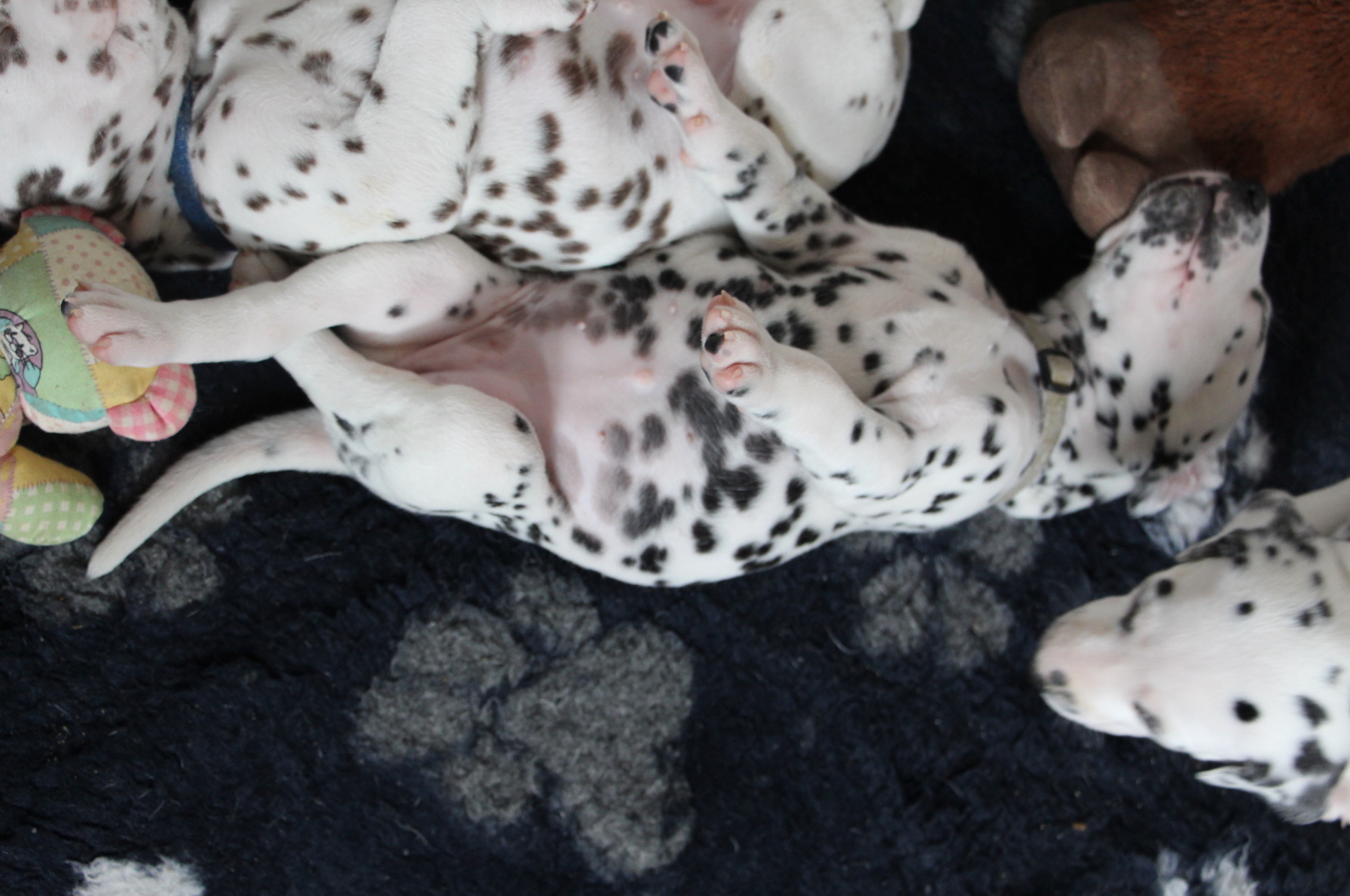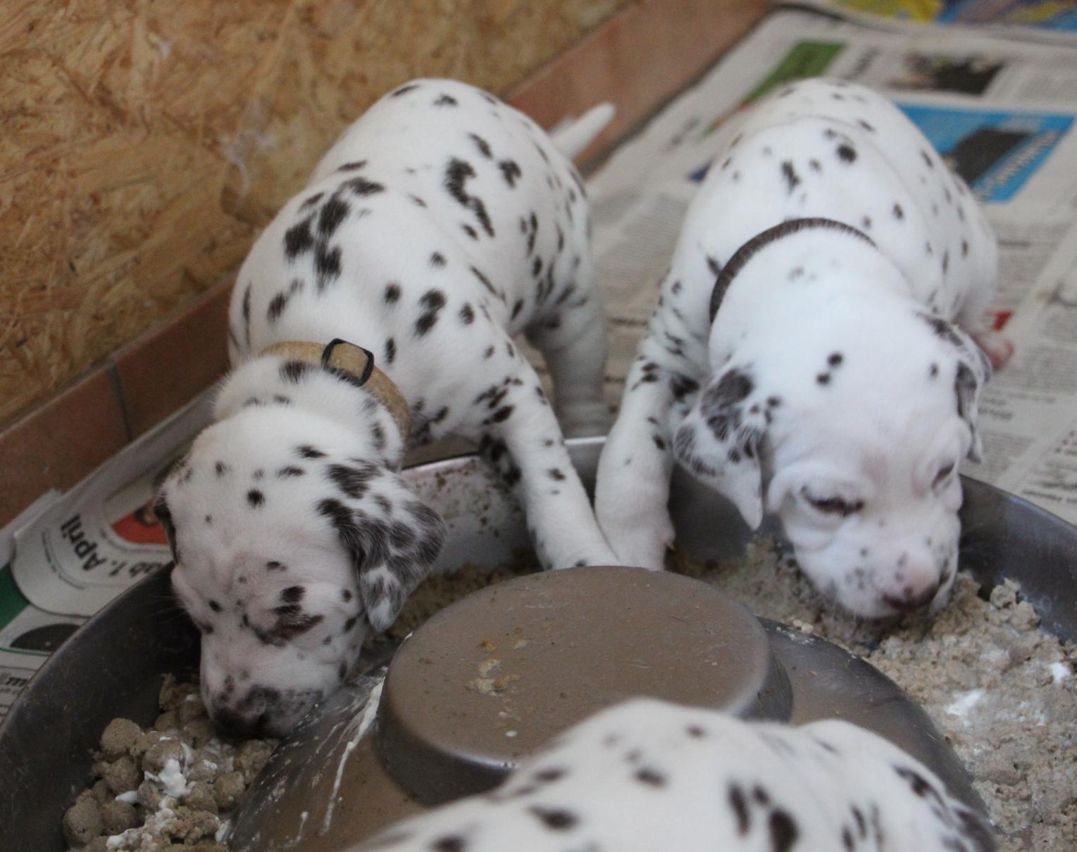 Hallihallo !!!Uns geht es Spitze!!!-Wir haben 2 Mamas --unsere allerbeste Dalmimama und unsere 2.Mama.-Die bringt immer Futter mit und da ist Joghurt drüber.--Lecker!!!-Sie sagt wir sollen gut essen ,damit wir groß und stark werden.-Was soll ich Euch sagen--wir essen gut --und abends immernoch Rindertartar !!!Wir haben auch schon ordentlich zugenommen von 2050 Gramm bis 2730 Gramm!