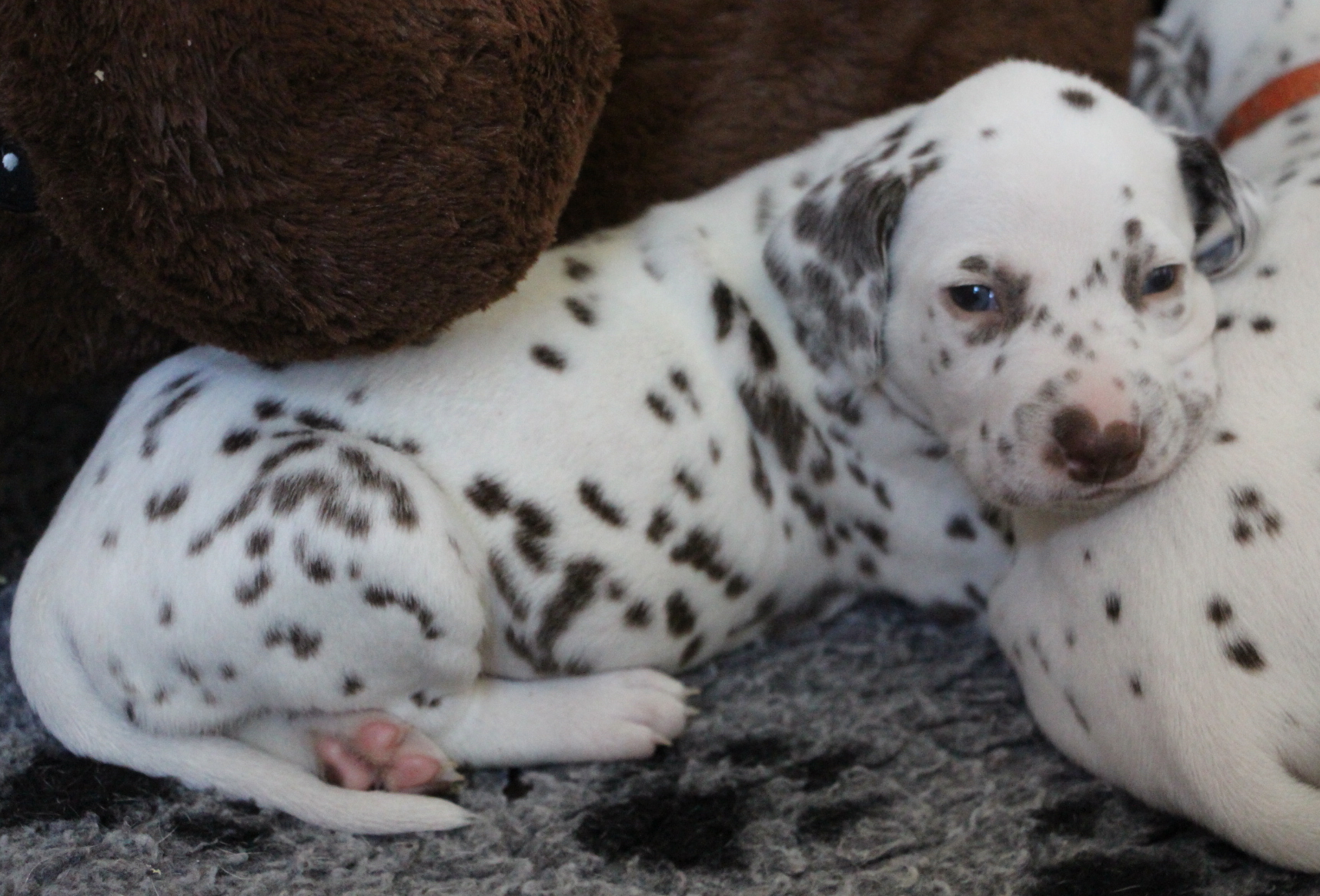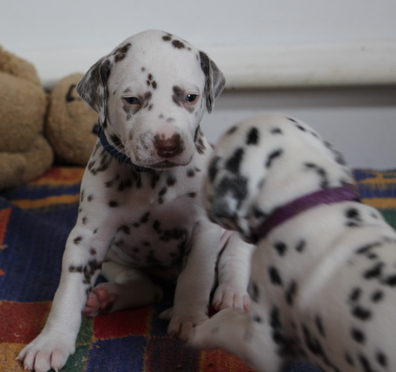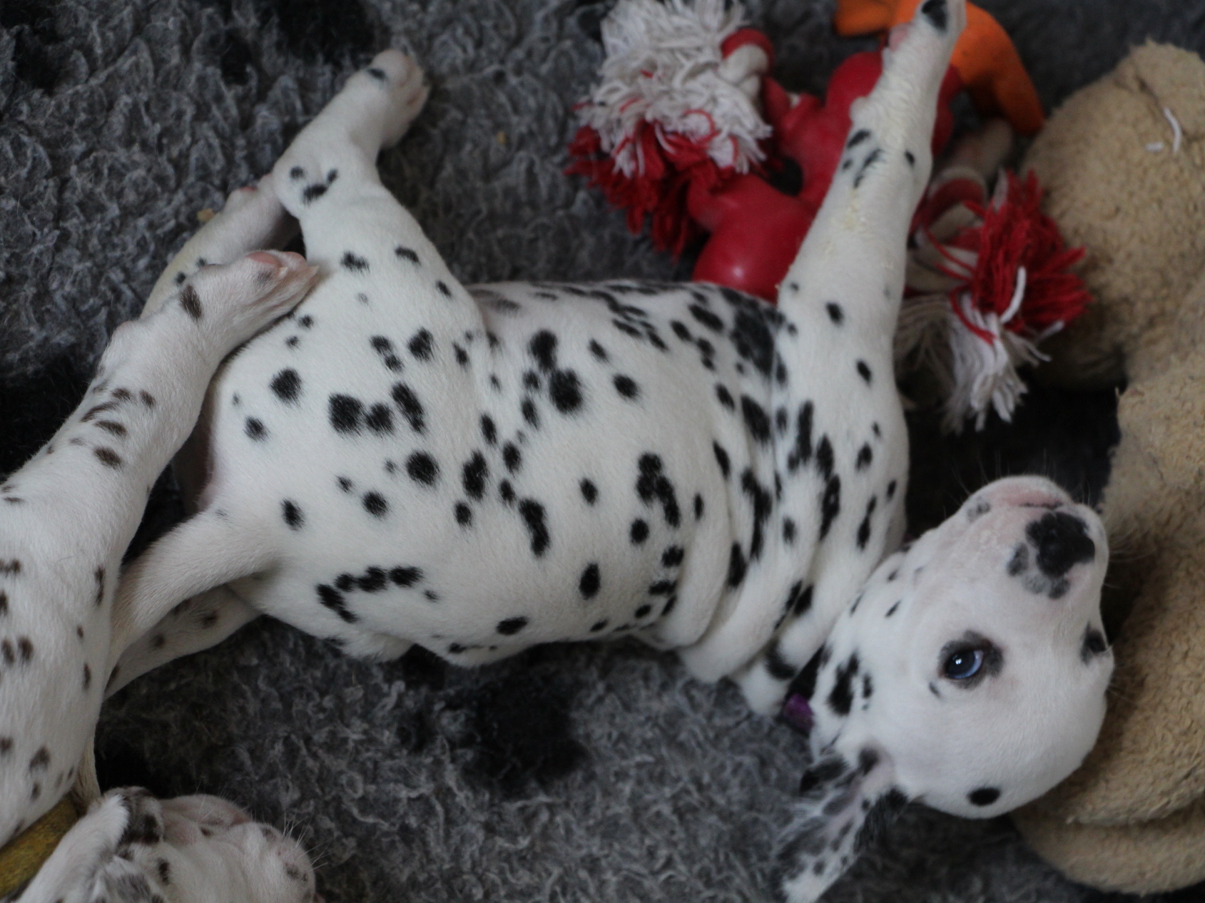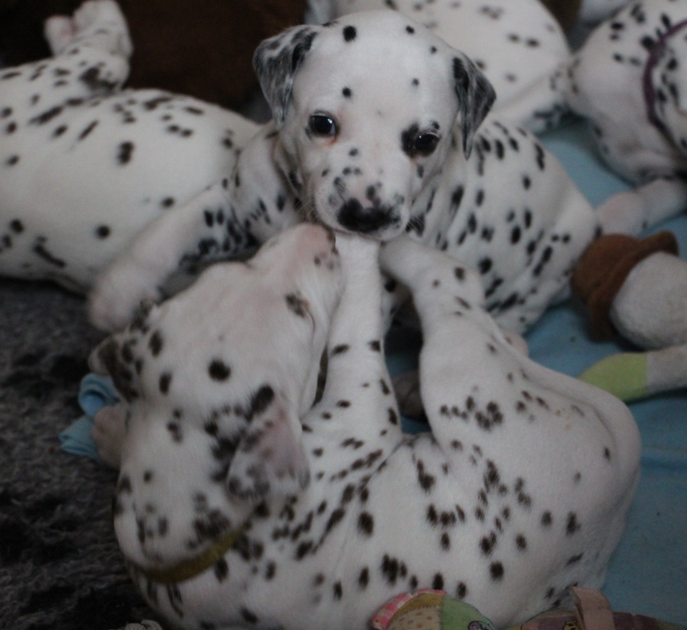Hallihallo !!!Uns geht es Spitze!!!-Wir haben 2 Mamas --unsere allerbeste Dalmimama und unsere 2.Mama.-Die bringt immer Futter mit und da ist Joghurt drüber.--Lecker!!!-Sie sagt wir sollen gut essen ,damit wir groß und stark werden.-Was soll ich Euch sagen--wir essen gut --und abends immernoch Rindertartar !!!Wir haben auch schon ordentlich zugenommen von 2050 Gramm bis 2730 Gramm!