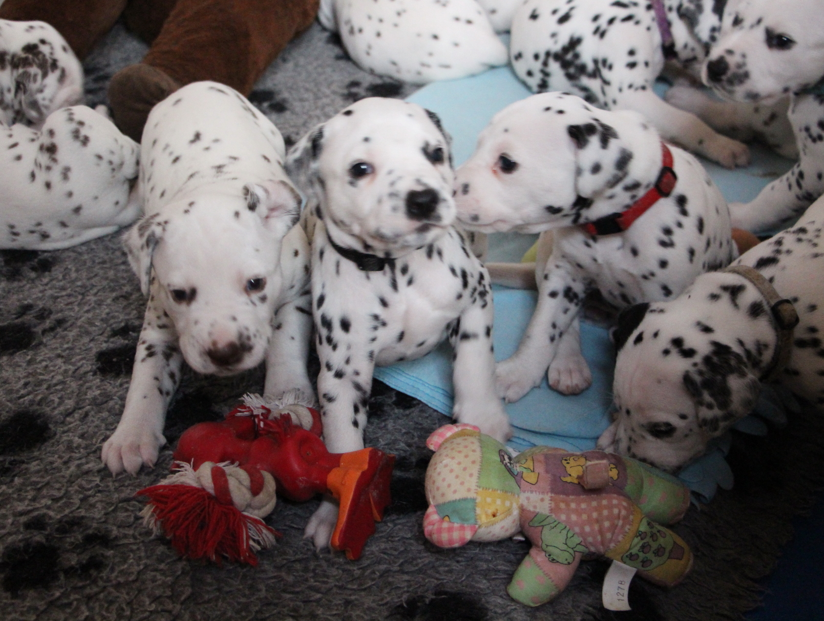 Die Sozialisierungsphase der Welpen hat begonnen und dauert etwa bis zur 12.Lebenswoche.In dieser Zeit entwickeln die Welpen die Mehrzahl ihrer sozialen Verhaltensweisen.Die Welpen werden nun immer aktiver und die Schlafphasen immer kürzer.Die Umwelterfahrungen der Welpen werden nun durch geruchliche ,besonders aber durch visuelle und akustische Reitze erweitert,die nun die Umwelt der Welpen bestimmen.Zahlreiche neue Verhaltensweisen im Sozialspiel;Objektspiel und in der Auseinandersetzung mit der Umwelt werden durchprobiert.Positive Lernerfahrungen vermitteln den Welpen ein Gefühl von emotionaler Sicherheit und Kontrolle für die an ihn gestellte Anforderung und deshalb sind in dieser Zeit soviele positive Erfahrungen wie möglich sehr wichtig um das Risiko von eventuell später auftretenden unangemessenen Meideverhalten in alltäglichen Situationen gering zu halten.