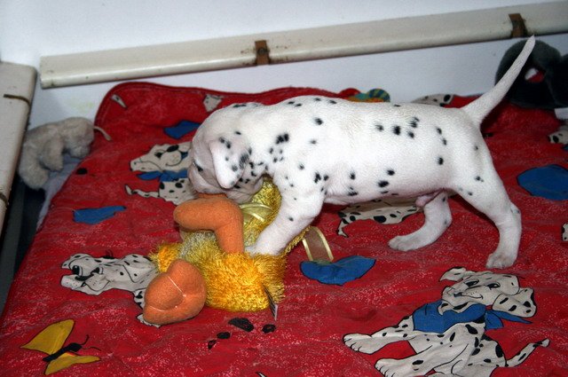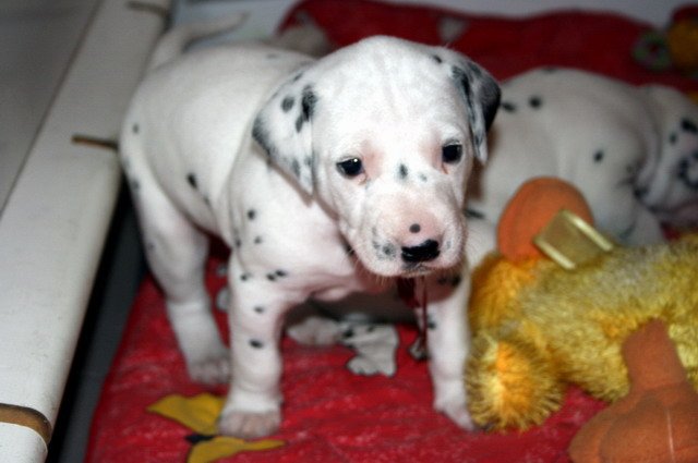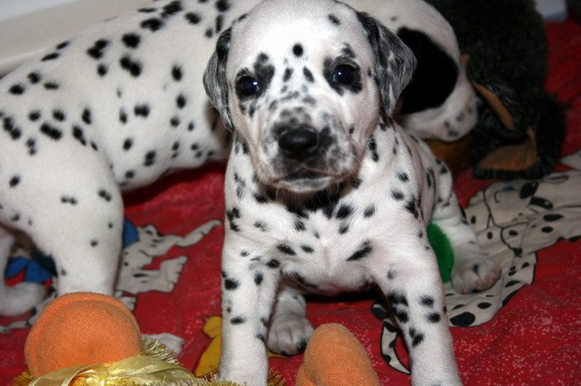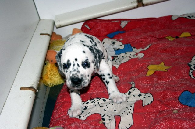 Es sind nun schon 4 Wochen vorbei und die Welpis entwickeln sich super!!Sie nehmen wunderbar zu und fressen das Welpenfutter sehr gerne.Dalmatinerlike wird gespielt,getobt,gerauft und gekuschelt. Auch die ersten Besucher waren schon da und hatten ihre Freude mit den Fleckenzwergen. Alle Babies haben wir gehörmäßig noch einmal nachgetestet und sie hören alle super!!!! Viel Spaß mit den Bildern der 4.Woche!