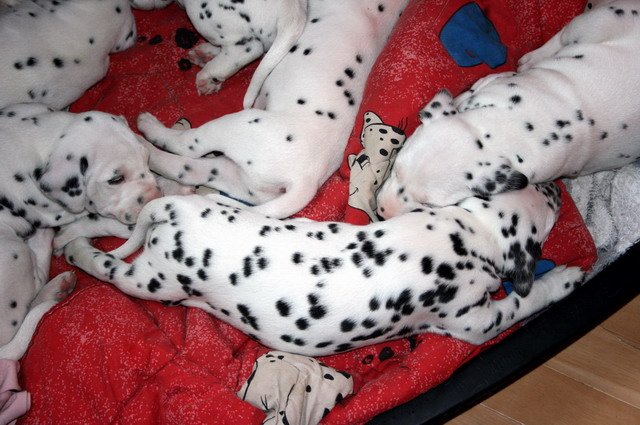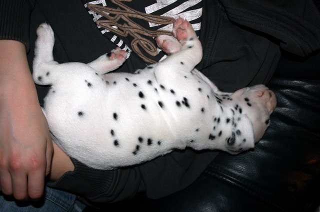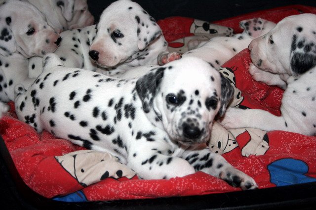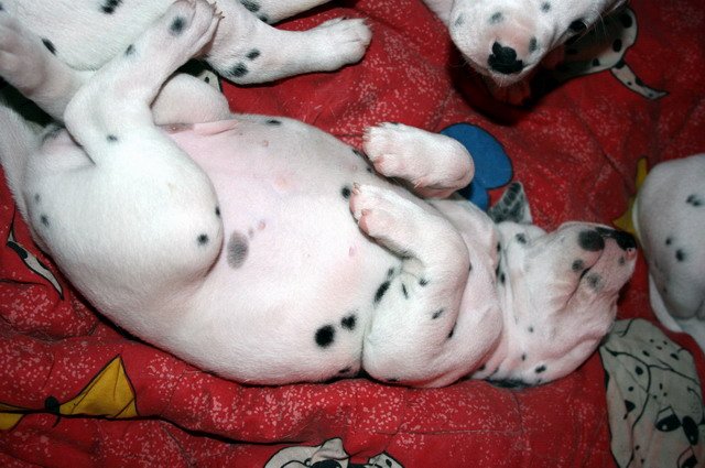 Es sind nun schon 4 Wochen vorbei und die Welpis entwickeln sich super!!Sie nehmen wunderbar zu und fressen das Welpenfutter sehr gerne.Dalmatinerlike wird gespielt,getobt,gerauft und gekuschelt. Auch die ersten Besucher waren schon da und hatten ihre Freude mit den Fleckenzwergen. Alle Babies haben wir gehörmäßig noch einmal nachgetestet und sie hören alle super!!!! Viel Spaß mit den Bildern der 4.Woche!