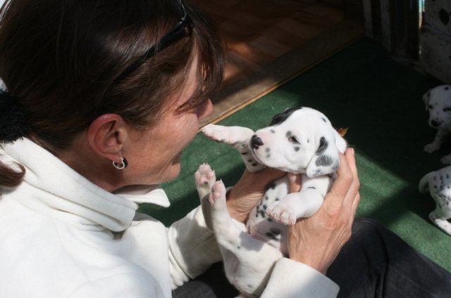 Eine Superwoche war unsere 5.Woche !!! Das Wetter ist toll und wir sind ins Welpenhaus umgezogen.Wir können drinnen und draußen spielen und toben und immer mehr gibt es zu entdecken !!!Wir hatten Besuch --auch von anderen Dalmis--es war wohl Verwandschaft von uns !!!--Wir werden bestimmt auch mal so groß!!-Dann hat unser Frauchen uns alle einzeln "getestet" wie sie sagt----danach hat sie uns alle abgeknutscht und gesagt,daß wir super hören !!!--Ja ,natürlich,wir wollen ja alles mitkriegen !!!! So,jetzt viel Spaß mit den neuen Fotos !!!