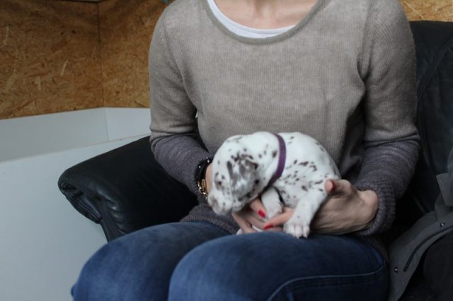 Hallihallo !--Uns geht es Spitze!--Wir haben 2 Mamas --unsere allerallerbeste Dalmimama und unsere 2.Mama.-Die bringt immer Futter mit und da ist noch Joghurt drüber !-Lecker !!! Sie sagt wir sollen gut essen,damit wir groß und stark werden.--Was soll ich Euch sagen---wir essen gut --und abends immernoch Rindertartar !-Wir haben auch schon ordentlich zugenommen von 2240 bis 2750 Gramm! Mama 2 sagt wir wären ganz schön neugierig!--Immer ,wenn sie zu uns kommt und dann wieder geht und die Tür nicht richtig zumacht laufen wir hinter ihr her ins Wohnzimmer!--Das macht Spaß --und da gibt es so viel zu sehen!!!--Jetzt hat sie gesagt der Raum reicht nicht mehr --wir ziehen um ins Welpenhaus !---Ein ganzes Haus für uns???!!!---Das wird super!--Ihr werdet sehen --bis nächste Woche!!!