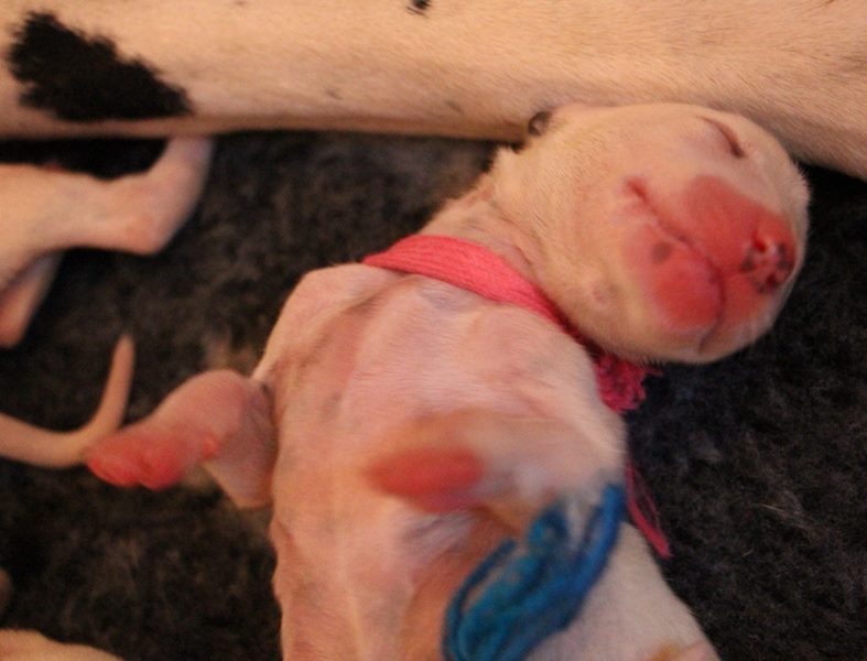 Am 12.06.2015 ist der erste Welpe das Fräulein rot mit 365 Gramm geboren.Der leichteste Welpe wog 310 Gramm und der schwerste 440 Gramm.Bändchen in allen Farben der späteren Welpenhalsbändchen hatte ich geflochten,da die kleinen halsbändchen in den ersten Tagen noch zu groß sind.So tragen die weiß /schwarzen Ladys gelb ; rosa ; gelb/orange (wird später lila) und die weiß/braunen Damen rot und orange.Die strammen weiß/schwarzen Jungs tragen schwarz ; grün ; grau; dunkelblau ; weiß mit blau und beige.Die strammen weiß /braunen Jungs tragen braun ; hellblau und weiß.