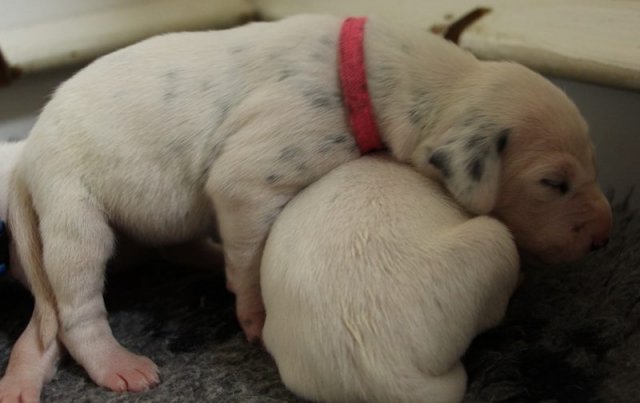Direkt mit der Geburt hat die neonatale Entwicklungsphase der Welpen begonnen--die Welpen werden mit geschlossenen Augenlidern und Gehörgängen geboren und werden als Nesthocker bezeichnet.Sie sind nun auf intensives Brutpflegeverhalten von Lady angewiesen.Auch können sie ihre Körpertemperatur noch nicht selbst regulieren und sind auf Körperkontakt zu Lady und ihren Geschwistern angewiesen.Tast und Geruchssinn sind bereits ausgeprägt und Berührungsreizen wird bereits ausgeprägt begegnet.Die neonatale Phase erstreckt sich über die ersten 2 Lebenswochen der Welpen.