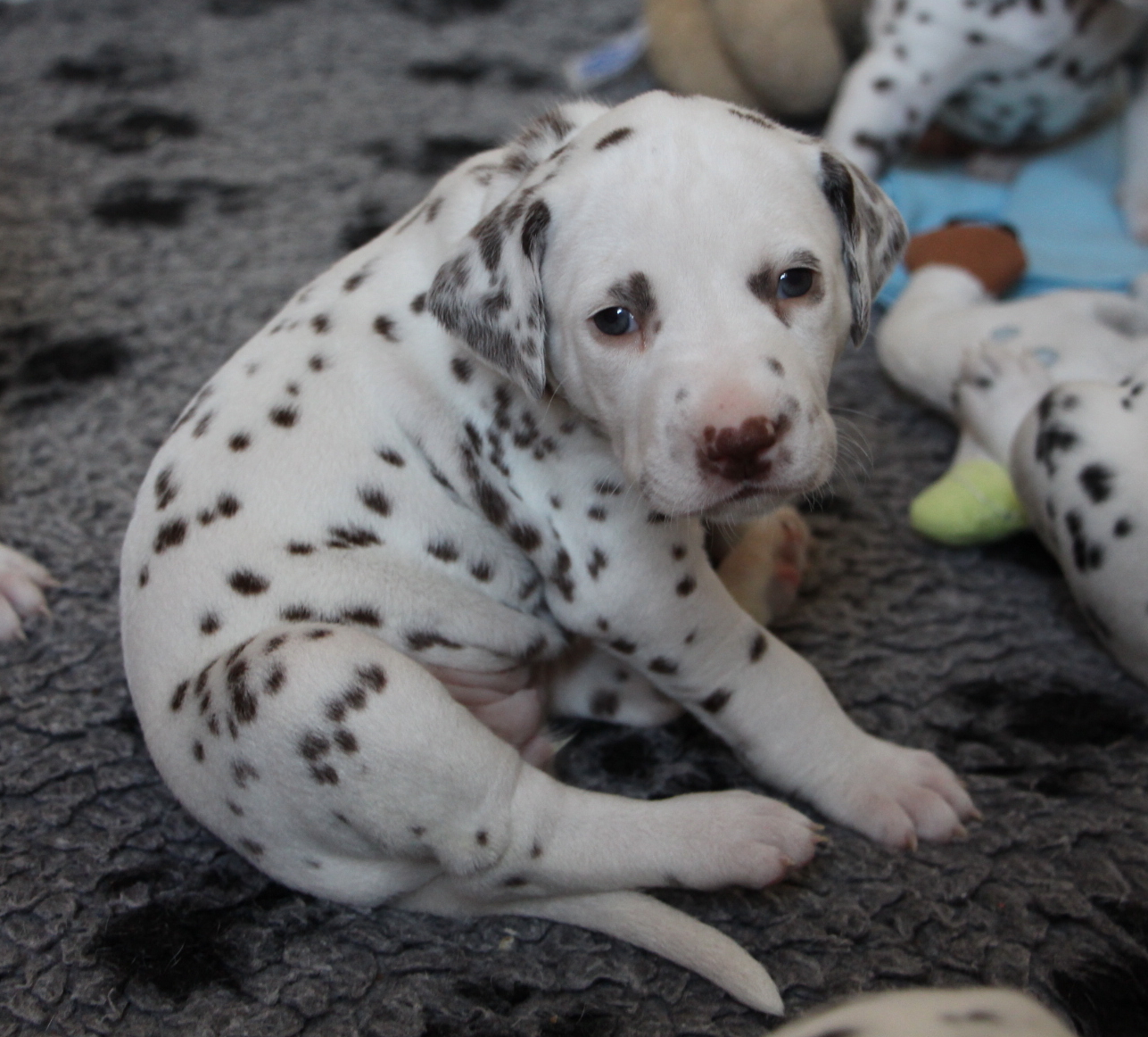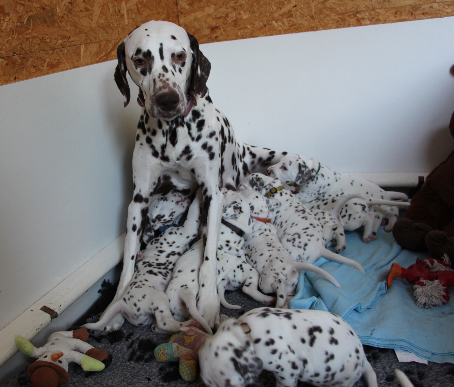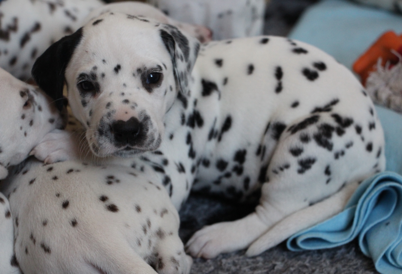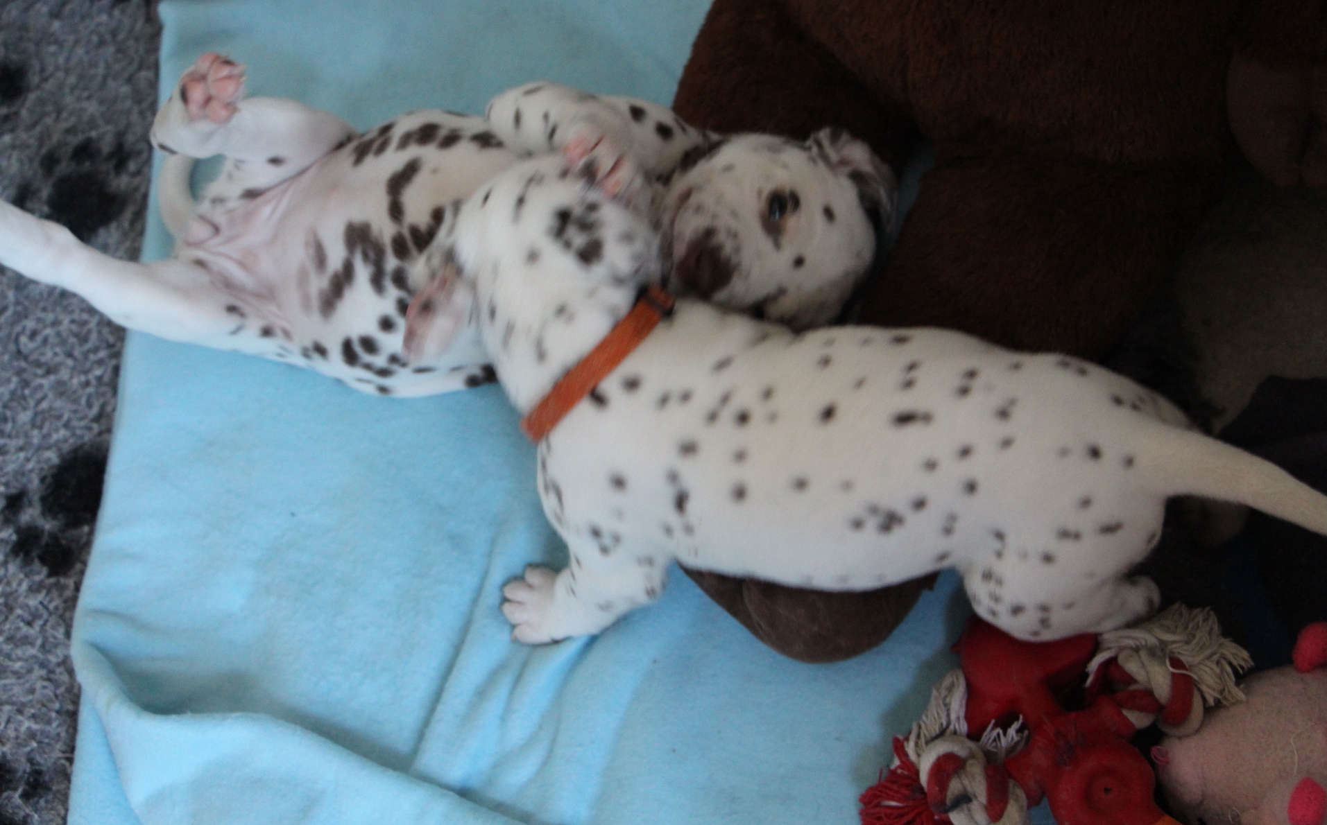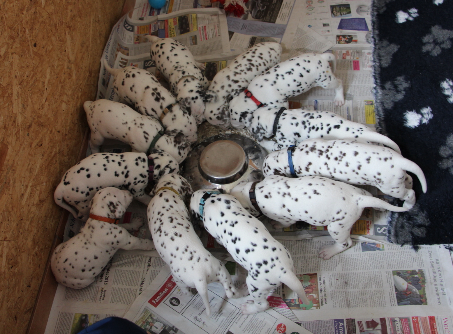 Hallihallo !!!Uns geht es Spitze!!!-Wir haben 2 Mamas --unsere allerbeste Dalmimama und unsere 2.Mama.-Die bringt immer Futter mit und da ist Joghurt drüber.--Lecker!!!-Sie sagt wir sollen gut essen ,damit wir groß und stark werden.-Was soll ich Euch sagen--wir essen gut --und abends immernoch Rindertartar !!!Wir haben auch schon ordentlich zugenommen von 2050 Gramm bis 2730 Gramm!