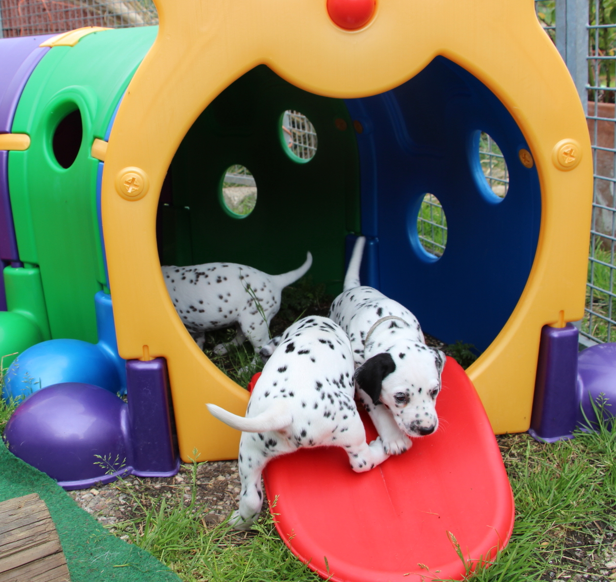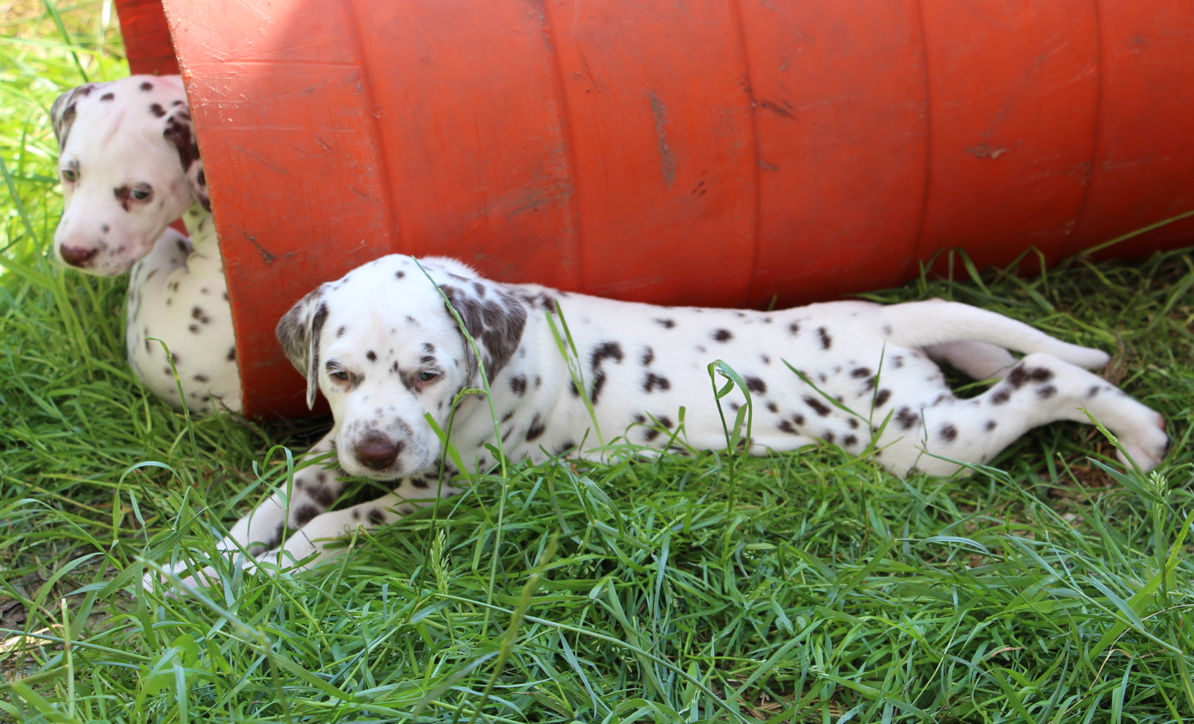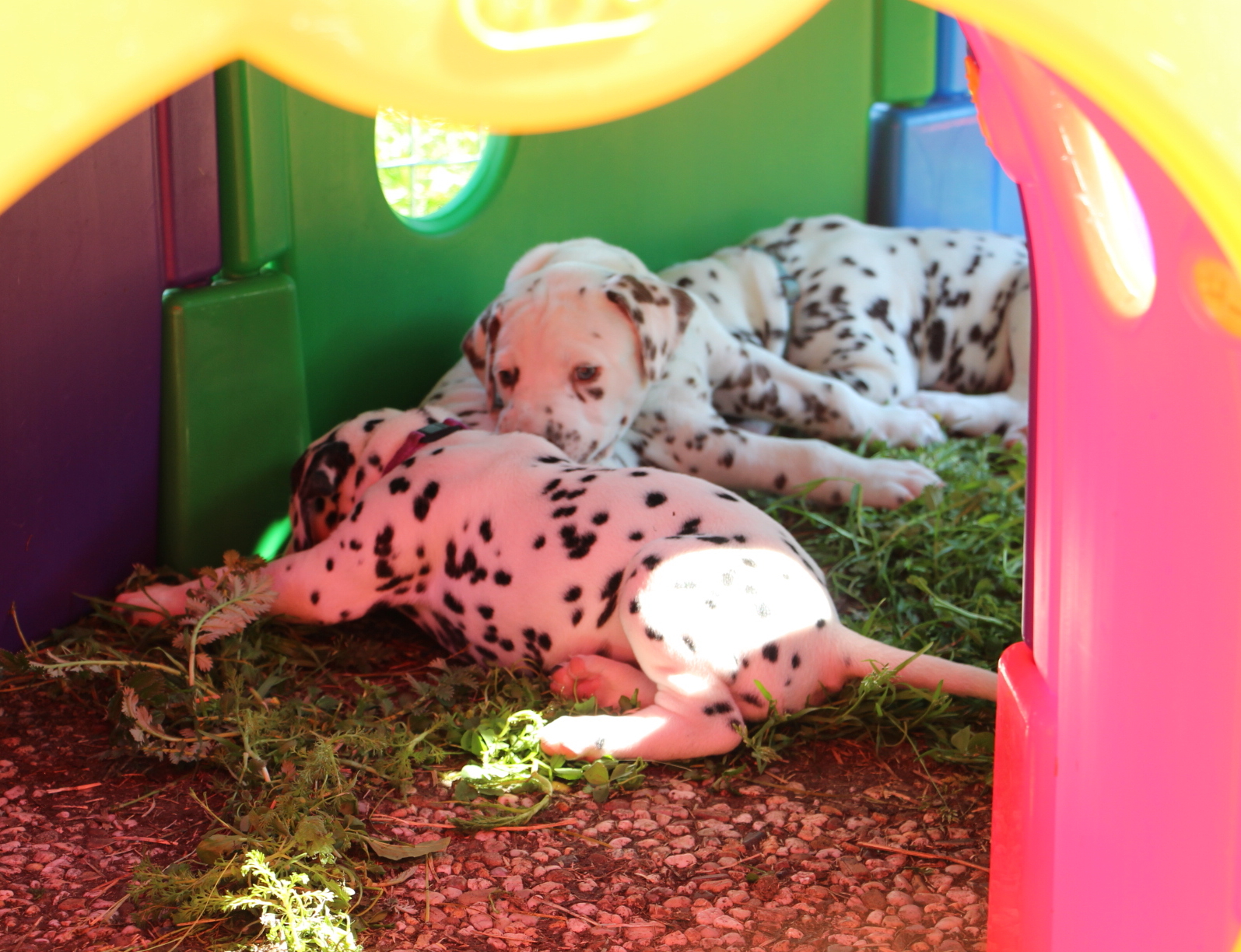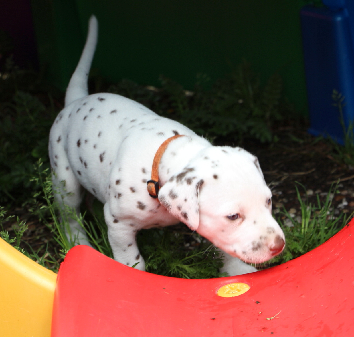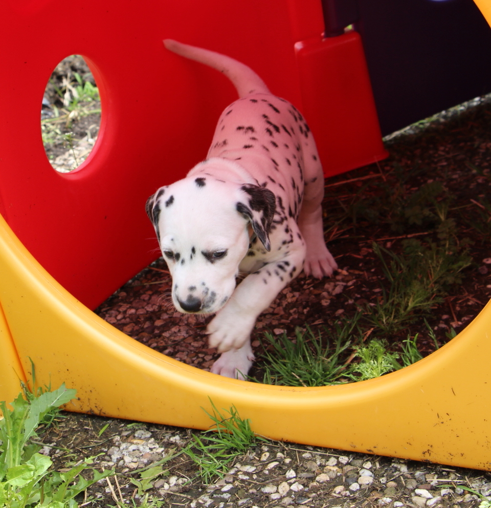 Die Welpen erkunden im Welpenhaus und im Auslauf täglich mehr und können dort frei selbst rein und rausgehen.Alles wird neugierig frei erkundet.Es geht durch die Tür hinaus;über den Kreisel ;durch das Bällebad und durch die Raupe.Das ist schon toll mitanzusehen ,wie sie es wie selbstverständlich alles ausprobieren.Am beliebtesten ist der Kreisel,wo sie schon balancieren müssen und motorisch total dazulernen.-Aber auch der wird mit Leichtigkeit gemeistert.--Auch die Raupe ist toll --wie ein Tunnel --aber auch eine Höhle und schön schattig ist es dadrin.Gefüttert wird jetzt 5 Mal am Tag --und es schmeckt ! Auch gab es jetzt die 2.Wurmkur.Die ganze Umwelt wird bewußt wahrgenommen und Besuch wird immer herzlich begrüßt !Alles wird ausprobiert und angeknabbert und die Neugier ist groß!Die Spielphasen werden immer länger aber danach wird auch immer ordentlich geschlafen und gekuschelt.Bei den sehr warmen Temperaturen wird jeder Schattenplatz genutzt und so haben wir jetzt auch die Sonnenschirme aufgespannt.