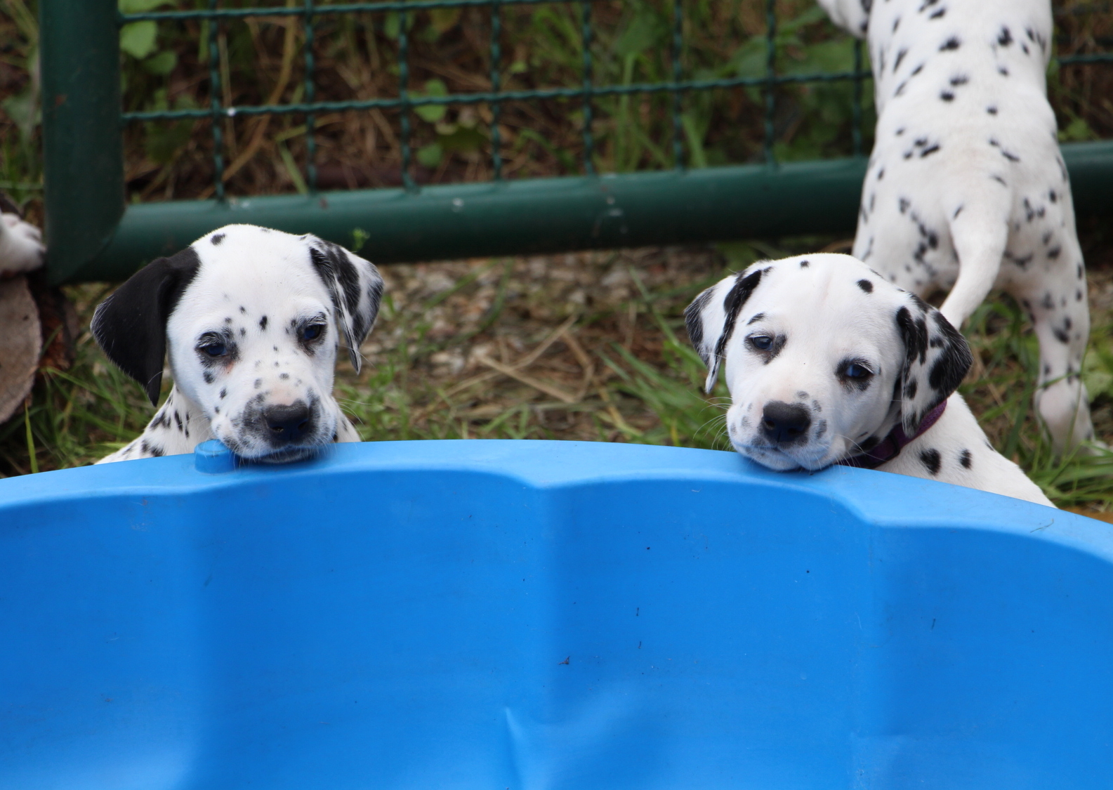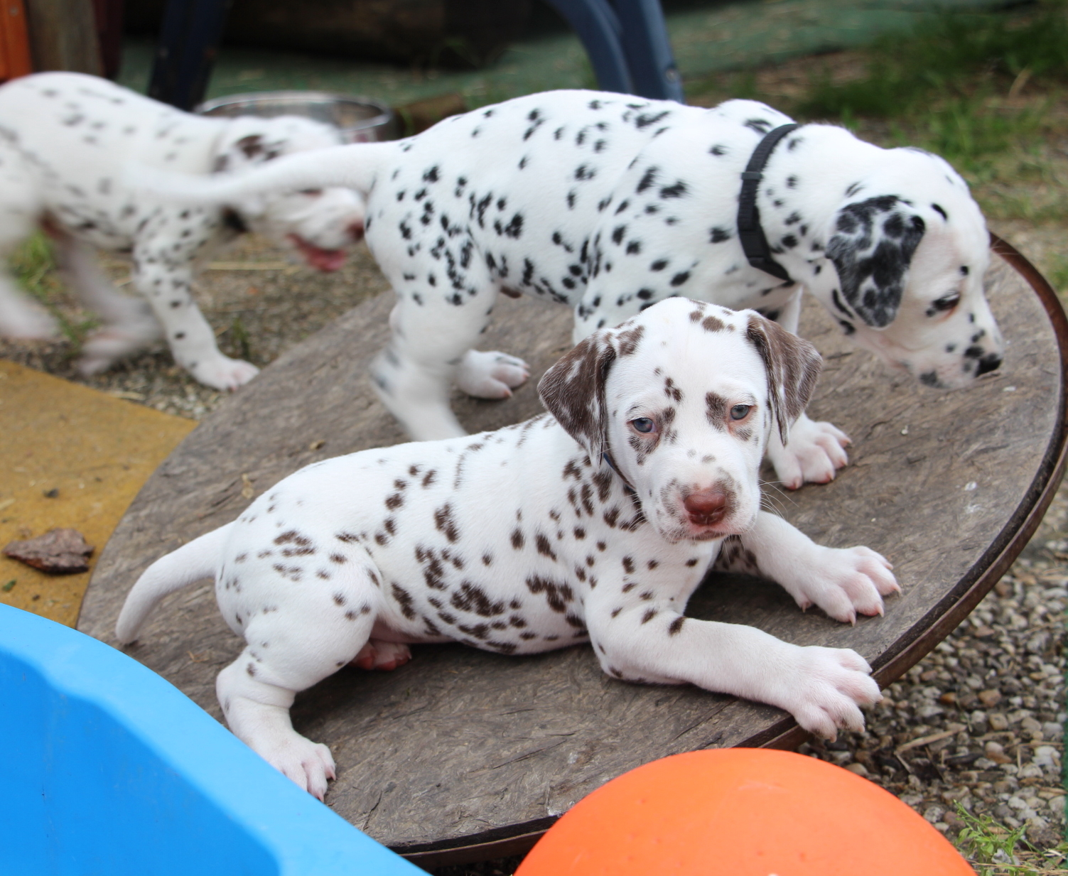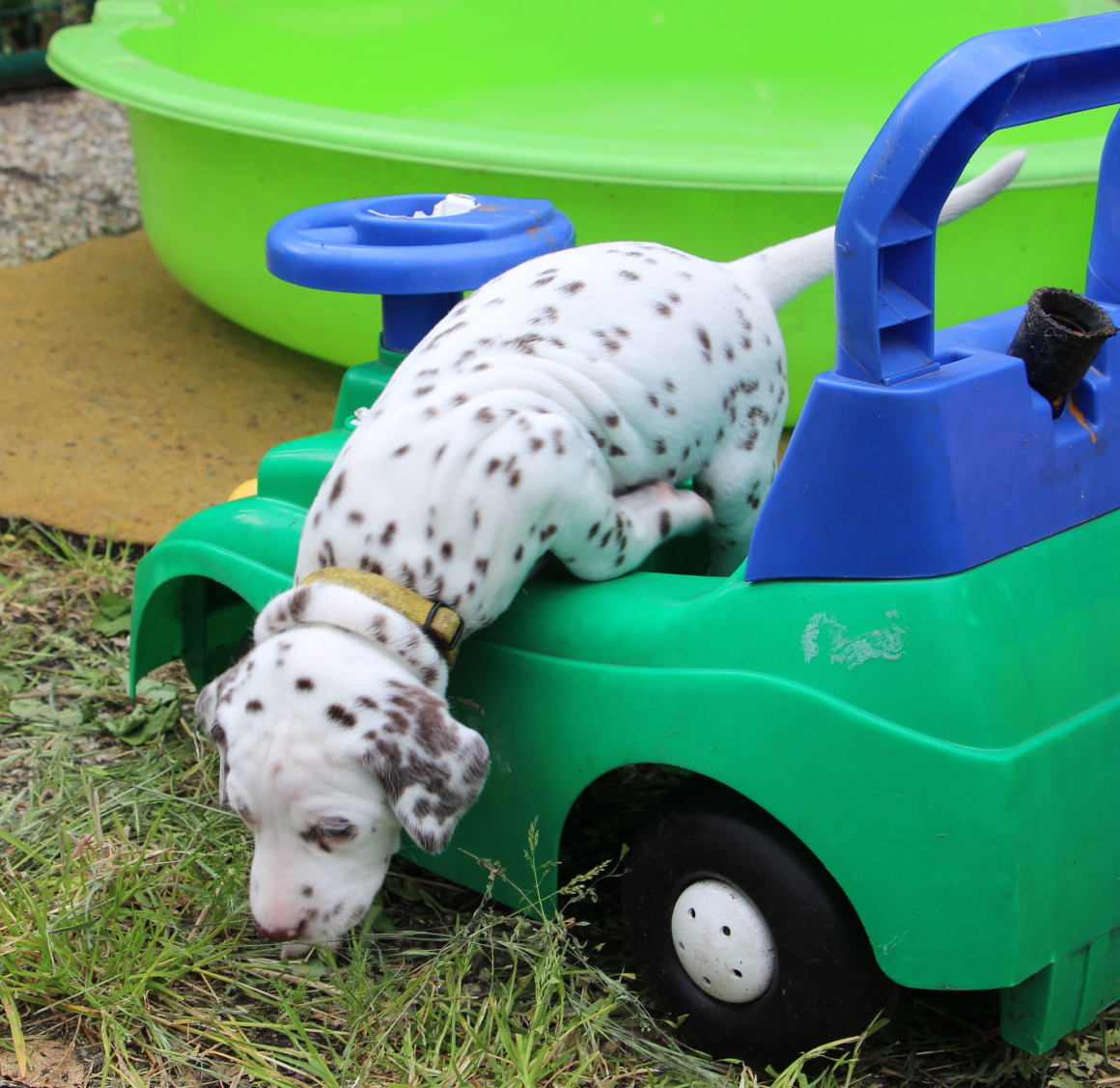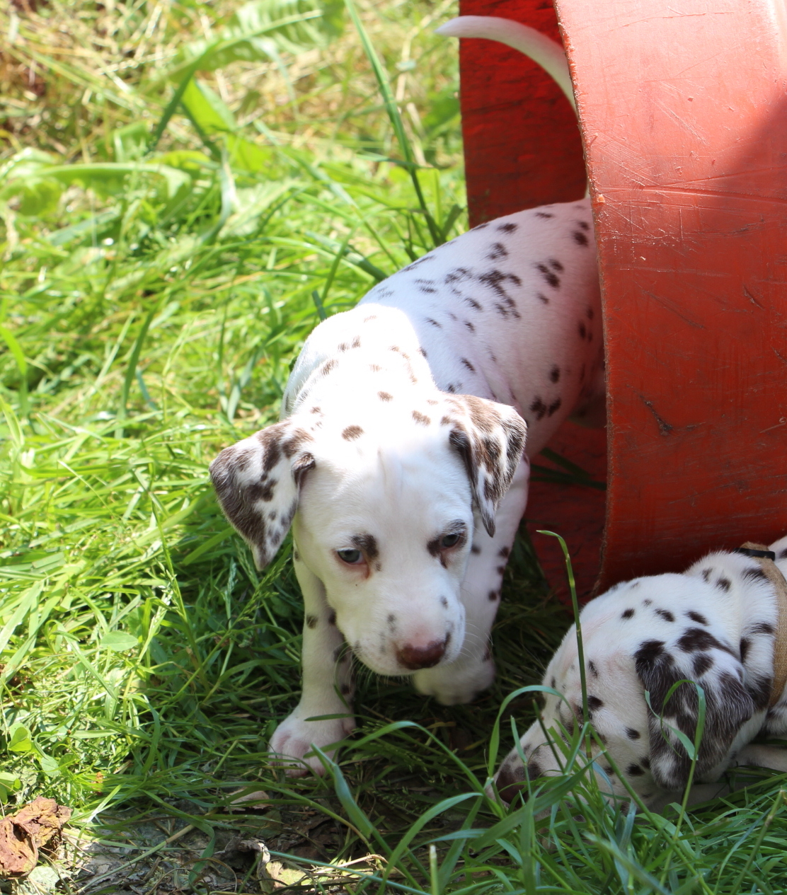 Die Welpen erkunden im Welpenhaus und im Auslauf täglich mehr und können dort frei selbst rein und rausgehen.Alles wird neugierig frei erkundet.Es geht durch die Tür hinaus;über den Kreisel ;durch das Bällebad und durch die Raupe.Das ist schon toll mitanzusehen ,wie sie es wie selbstverständlich alles ausprobieren.Am beliebtesten ist der Kreisel,wo sie schon balancieren müssen und motorisch total dazulernen.-Aber auch der wird mit Leichtigkeit gemeistert.--Auch die Raupe ist toll --wie ein Tunnel --aber auch eine Höhle und schön schattig ist es dadrin.Gefüttert wird jetzt 5 Mal am Tag --und es schmeckt ! Auch gab es jetzt die 2.Wurmkur.Die ganze Umwelt wird bewußt wahrgenommen und Besuch wird immer herzlich begrüßt !Alles wird ausprobiert und angeknabbert und die Neugier ist groß!Die Spielphasen werden immer länger aber danach wird auch immer ordentlich geschlafen und gekuschelt.Bei den sehr warmen Temperaturen wird jeder Schattenplatz genutzt und so haben wir jetzt auch die Sonnenschirme aufgespannt.
