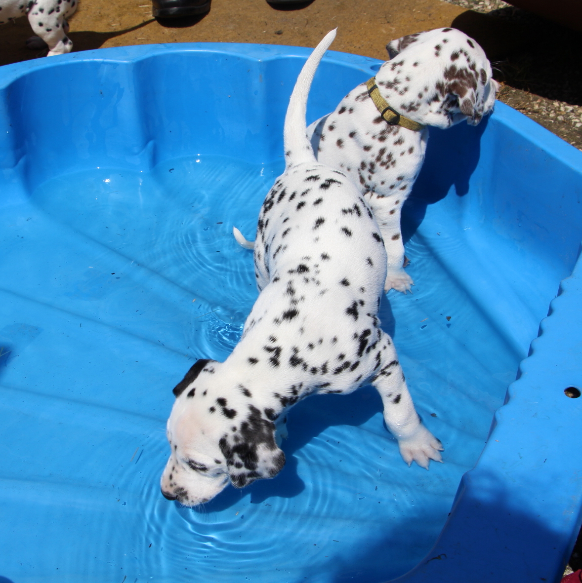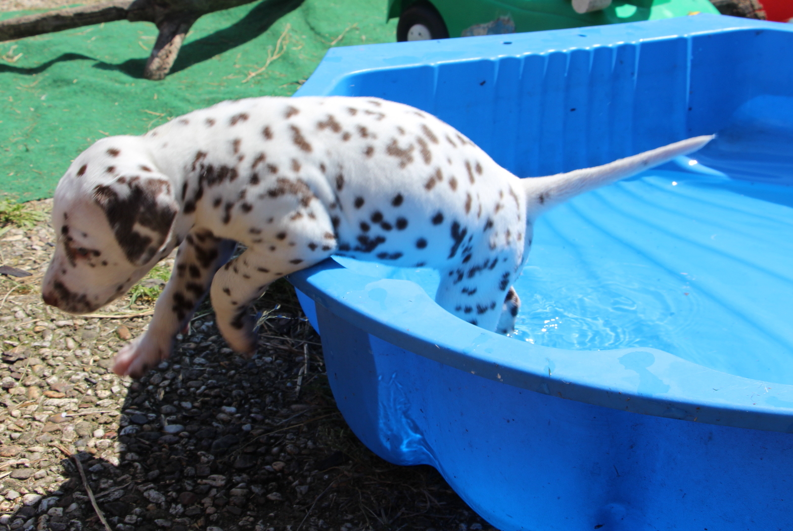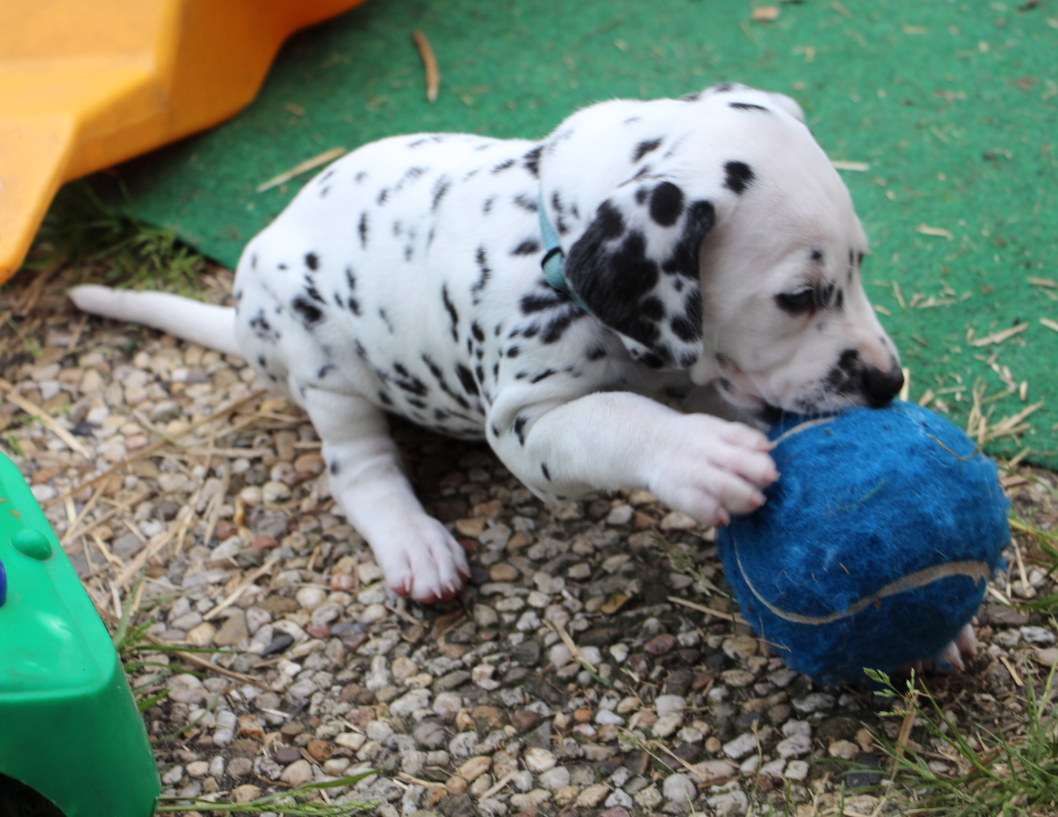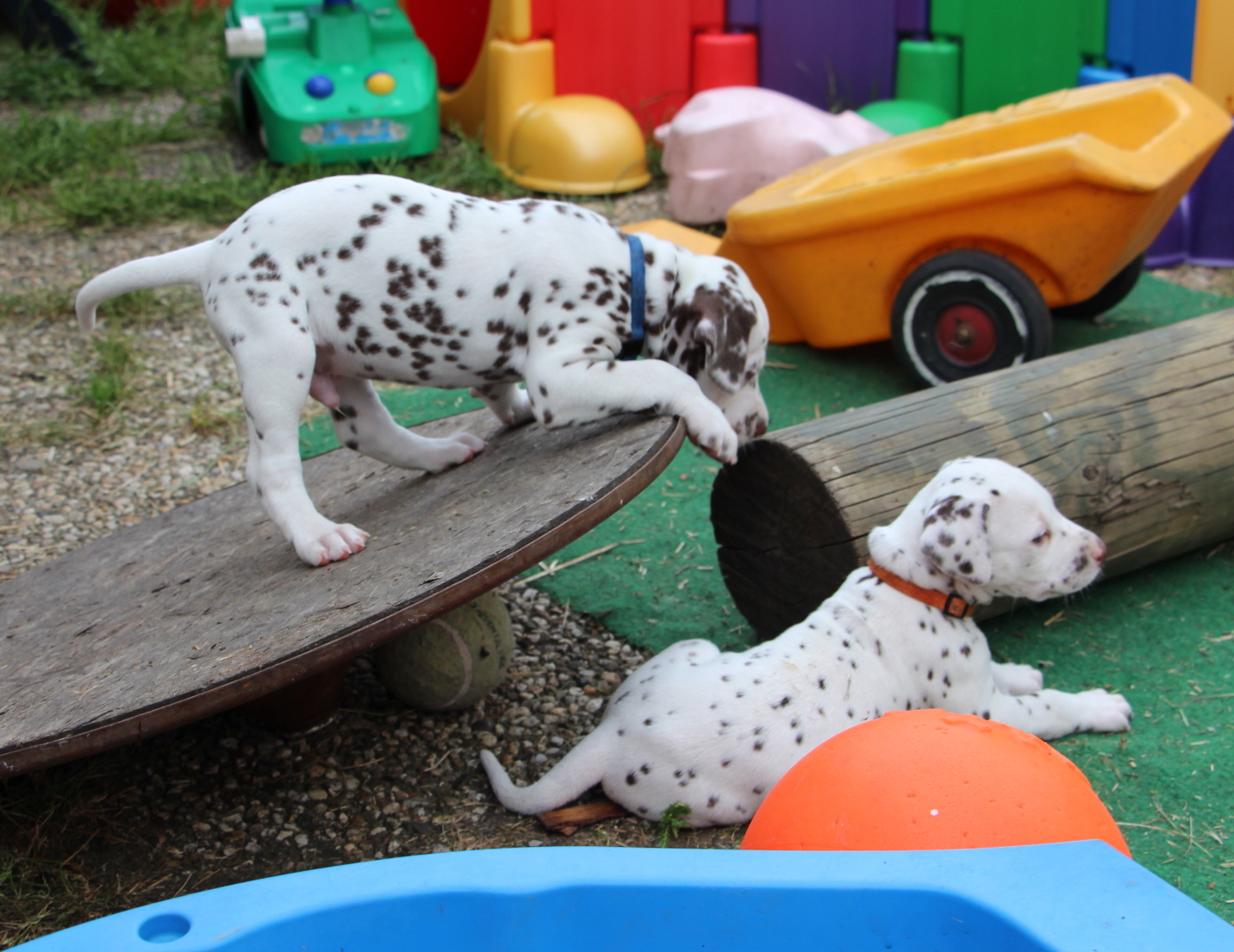 Die Welpen erkunden im Welpenhaus und im Auslauf täglich mehr und können dort frei selbst rein und rausgehen.Alles wird neugierig frei erkundet.Es geht durch die Tür hinaus;über den Kreisel ;durch das Bällebad und durch die Raupe.Das ist schon toll mitanzusehen ,wie sie es wie selbstverständlich alles ausprobieren.Am beliebtesten ist der Kreisel,wo sie schon balancieren müssen und motorisch total dazulernen.-Aber auch der wird mit Leichtigkeit gemeistert.--Auch die Raupe ist toll --wie ein Tunnel --aber auch eine Höhle und schön schattig ist es dadrin.Gefüttert wird jetzt 5 Mal am Tag --und es schmeckt ! Auch gab es jetzt die 2.Wurmkur.Die ganze Umwelt wird bewußt wahrgenommen und Besuch wird immer herzlich begrüßt !Alles wird ausprobiert und angeknabbert und die Neugier ist groß!Die Spielphasen werden immer länger aber danach wird auch immer ordentlich geschlafen und gekuschelt.Bei den sehr warmen Temperaturen wird jeder Schattenplatz genutzt und so haben wir jetzt auch die Sonnenschirme aufgespannt.