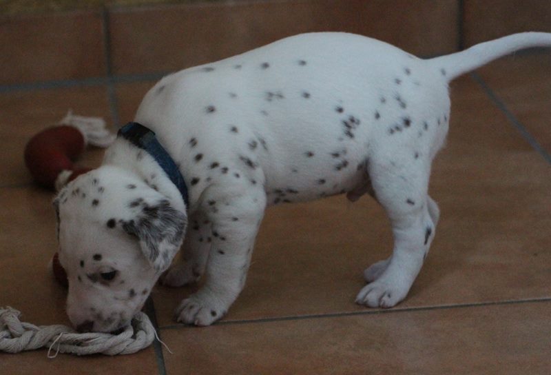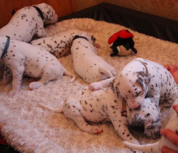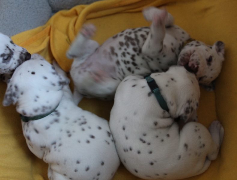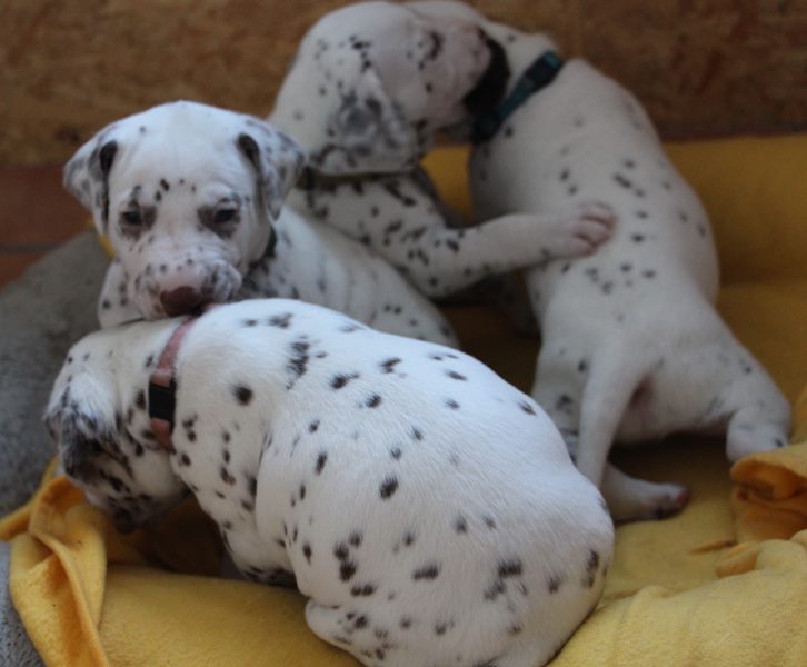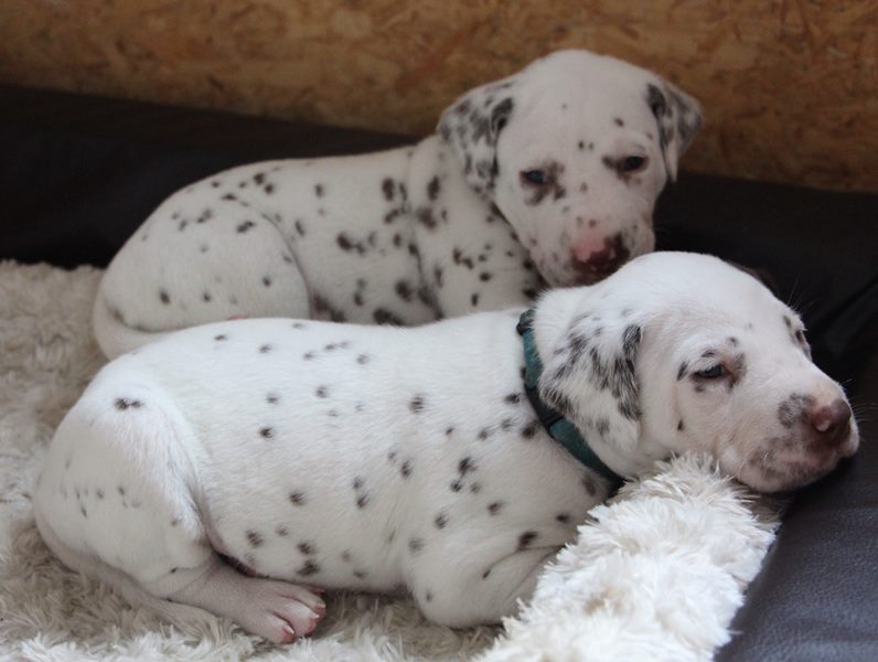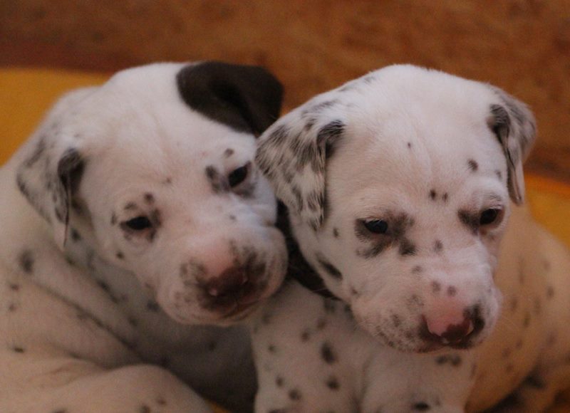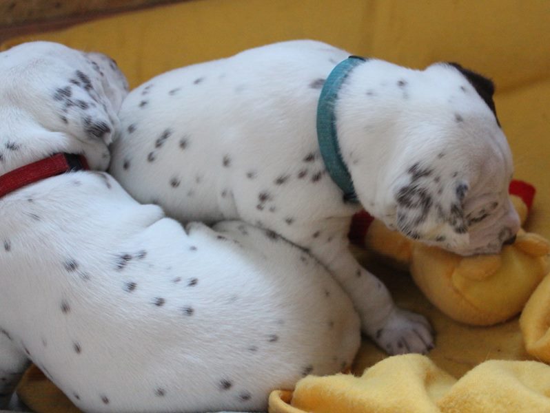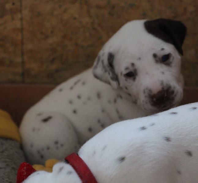 Hallihallo !--Uns geht es Spitze!--Wir haben 2 Mamas --unsere allerallerbeste Dalmimama und unsere 2.Mama.-Die bringt immer Futter mit und da ist noch Joghurt drüber !-Lecker !!! Sie sagt wir sollen gut essen,damit wir groß und stark werden.--Was soll ich Euch sagen---wir essen gut --und abends immernoch Rindertartar !-Wir haben auch schon ordentlich zugenommen von 2170 bis 2960 Gramm! Mama 2 sagt wir wären ganz schön neugierig!