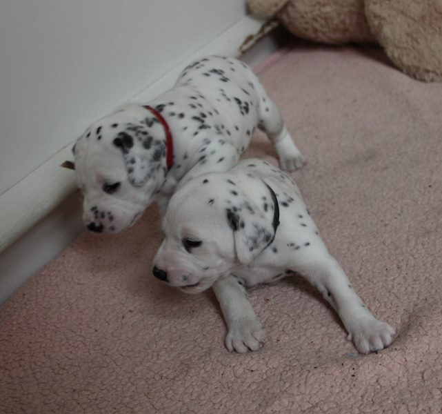 Hallihallo--uns geht es spitze!!!--Wir haben 2 Mamas !!!Natürlich unsere weltbeste Dalmimama und unsere 2.Mama .Die bringt immer Futter mit und da ist noch Joghurt drüber --lecker !--Sie sagt ,wir sollen gut essen,damit wir groß und stark werden .--Und was soll ich Euch sagen --wir essen gut und dann Abends immer Rindertartar noch !Wir haben auch schon ordentlich zugenommen von 2070 Gramm bis 2660 Gramm.
