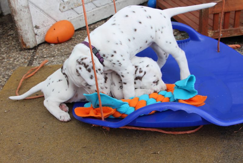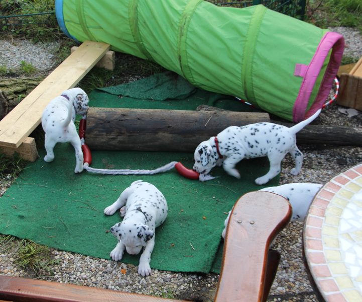 6 Wochen sind schon um---die Welpen sind 6 Wochen alt und die Zeit vergeht viel zu schnell!!!Toll entwickelt haben sie sich --alle Welpen hören;die Augensäume sind alle geschlossen.Die Welpen sind aufgeschlossen,neugierig ,freundlich ;zufrieden;gelassen;verspielt;verschmust ;ausgeglichen und freuen sich über jeden Besuch.Motorisch haben sie schon richtig dazugelernt:sie klettern ,balancieren,schaukeln,rennen und toben.Alles Neue wird erkundet und ausprobiert.Mit Vorliebe suchen sie immer wieder den Körperkontakt und die Nähe zu uns und den Besuchern einfach zu allen Menschen.Auch unsere anderen großen Hunde haben die Welpen im Auslauf schon besucht und untersucht--alles eine große Familie!Alles Eindrücke und Erfahrungen ,die die Welpen prägen und sozialisieren.