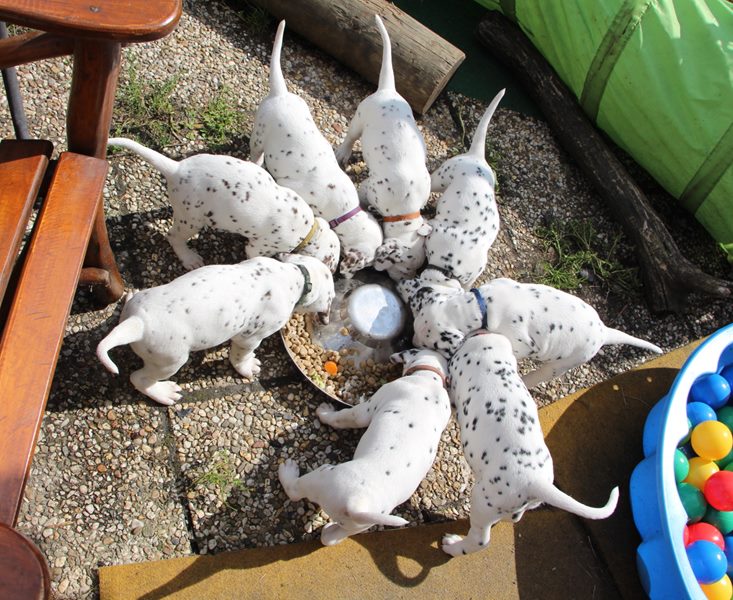 Hallo Leute--das Leben ist herrlich!!!--Das Wetter ist toll--wir können den ganzen Tag draußen spielen und dort auch einfach einschlafen,wenn wir müde sind !Unsere 2.Mama läßt sich immer wieder etwas Neues einfallen,was es zu fressen gibt--und es schmeckt !!!--Die weiß schon was wir mögen !Also,so viele Geschwister,daß ist toll--wir finden immer jemanden zum Spielen und dann geht es richtig rund.Unser Opa Quaterback kommt uns auch immer öfter besuchen,und die Oma und Onkel Harry und und und...Hier ist immer etwas los !!!-Ordentlich zugenommen haben wir wieder und die Halsbändchen werden langsam eng--wir wiegen zwischen 3720 Gramm und 4480 Gramm.--So,jetzt viel Spaß mit den Bildern!