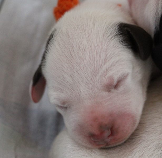 Fräulein Orange ,eine weiß/braune Hündin-geboren um 17.03 Uhr  mit einem Geburtsgewicht von 340 Gramm!!